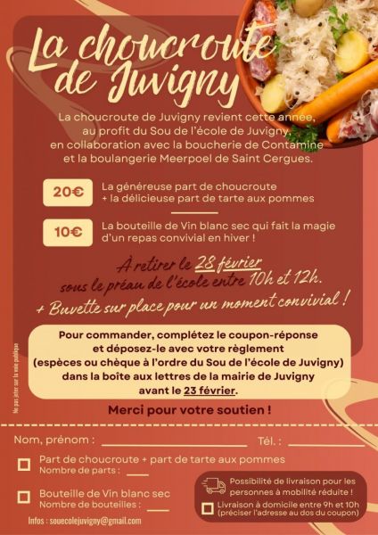 Le Sou de l'école vous propose une vente de choucroute à emporter le samedi 28 février 2026 à l'école, et vous accueille avec un stand pour partager un verre et papoter un peu entre 10h et 12h.